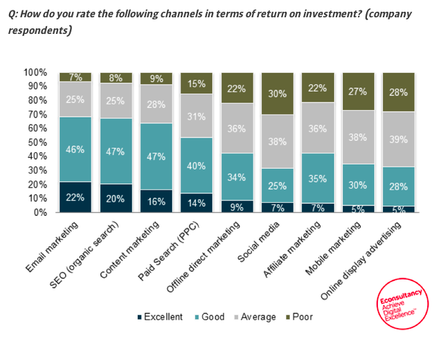 ปล. ข้อมูลจากเว็บไซต์ econsultancy.com สรุปรายงานในปี 2014 ที่มีการทำแบบสอบถาม marketer จำนวนหนึ่งให้จัดอันดับชาแนลที่มีค่า ROI สูงสุด ผลออกมาว่า email marketing เป็น channel ที่มี ROI ดีที่สุดเป็นอันดับหนึ่ง (แม้จะเป็นรายงานจากเมืองนอก แต่จากข้อมูลที่ผมมีในหลาย account อีเมล์จัดเป็นท้อป 3 อยู่เสมอหากมีการ optimized และวัดผลอย่างสม่ำเสมอ รวมถึงมีฐานอีเมล์ที่มีคุณภาพด้วย)