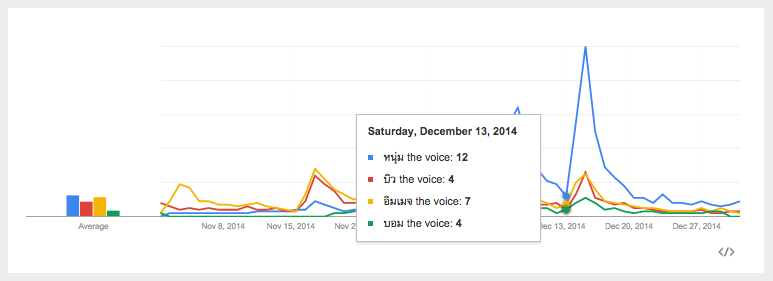 กราฟด้านบนเป็นการแสดงจำนวนการค้นหาใน Youtube ที่เกี่ยวกับผู้เข้าแข่งขันในรอบตัดสินของ The voice Thailand season 3 ซึ่งก็คือ หนุ่ม(เส้นสีฟ้า) อิมเมจ(เส้นสีส้ม) บิว(เส้นสีแดง) และ บอม(เส้นสีเขียว) กราฟนี้พอวิเคราะห์ดูแล้วก็ต้องประหลาดใจครับ เพราะหากใครที่ติดตามรายการนี้ก็น่าจะพอดูออกว่าเทรนด์มันเป็นอย่างนั้นจริงๆ คือในช่วงแรก บิวและอิมเมจ มาแรงมาก จนกระทั่งช่วงวันที่ 7 ธันวาคม เส้นกราฟของ บอมและหนุ่มเพิ่มขึ้นอย่ารวดเร็ว ซึ่งเป็นช่วงที่ทั้งสองคนนี้มีการพัฒนาทั้งเรื่องการร้องและการแสดงได้ดี โดยเฉพาะของหนุ่ม (เส้นสีฟ้า) ซึ่งเป็นการโตแบบก้าวกระโดดมากหลังจากวันที่ 7 ธันวาคม ซึ่งเป็นวันที่เขาร้องเพลง “หลงตัวเอง” ของอนันต์ บุญนาค และทำให้เขาได้รับความสนใจอย่างสูง คราวนี้มาดูกราฟถัดไปซึ่งจะทำให้ต้องประหลาดใจกว่าเดิม