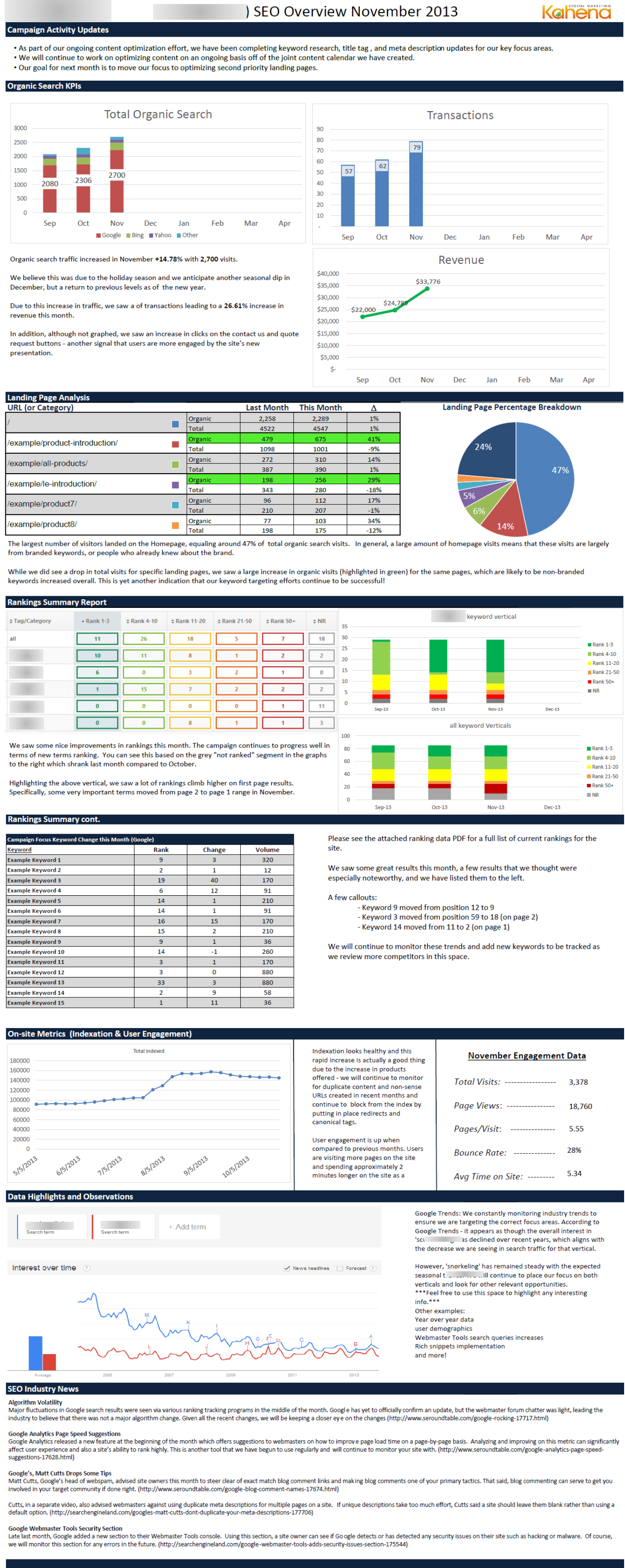 ข้อมูลในส่วนนี้จะเป็นข้อมูลที่เอาไว้ใช้ support ข้อมูลในส่วน KPIs ว่าทำไมผลลัพธ์ถึงออกมาเช่นนั้น ส่วนนี้แหละครับคือ “เหตุผล” ที่ผู้ฟังอยากรู้ ซึ่งเป็นสิ่งผมพูดถึงไว้ในช่วงต้น ตัวอย่างของรีพอร์ทแยกแสดงข้อมูลเป็นส่วนของ Landing page ที่ทำการออปติไมซ์ และกลุ่มของ keywords และ Ranking ซึ่งถือว่าเป็นคีย์สำคัญของการเติบโตของ Organic traffic