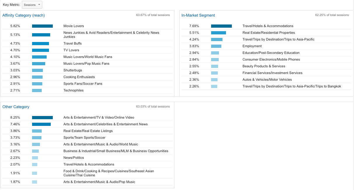 - Interests ความสนใจของผู้เข้าชมเว็บไซต์ (Audience) ซึ่งเป็นค่าที่ Google เก็บจากพฤติกรรมการเข้าเว็บไซต์ต่างๆ ของแต่เครื่อง นั่นหมายความว่า หาก Interest ใดมีค่าที่สูง แสดงว่ากลุ่มคนเข้าเว็บไซต์ของเราส่วนใหญ่มีความสนใจและ Lifestyle ตาม interests นั้นๆ การเขียน Content ก็สามารถที่จะเลือกเขียนให้ตรงกับ Interest ของคนส่วนใหญ่ได้