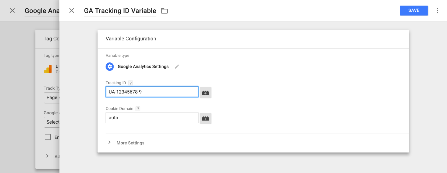 ระบุหมายเลข Tracking ID ของ Google Analytics ในช่อง Tracking ID - กด Save เพื่อกลับมาที่หน้าการเซ็ตอัพ Tag อีกครั้ง ก็จะเห็นว่าช่อง Google Analytics Settings จะมีค่าตัวแปร Variable ซึ่งเป็นชื่อที่เราตั้งไว้ก่อนหน้านี้ขึ้นมาแล้วเป็นค่าดังนี้ {{GA Tracking ID Variable}} ตามภาพตัวอย่าง ประโยชน์ที่สำคัญในการสร้างตัวแปรเพื่อเก็บค่า Tracking ID นี้ก็คือจะทำให้เราสามารถเรียกใช้งาน Variable นี้ได้เมื่อเราต้องสร้าง Tag ที่มีการใช้ GA Tracking ID นี้อีกครั้ง ซึ่งช่วยให้ทำงานได้เร็วและลดความผิดพลาดที่อาจจะเกิดขึ้นได้ด้วย