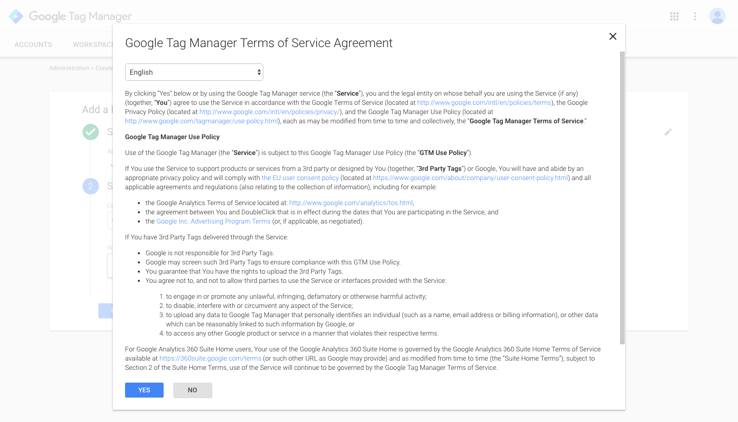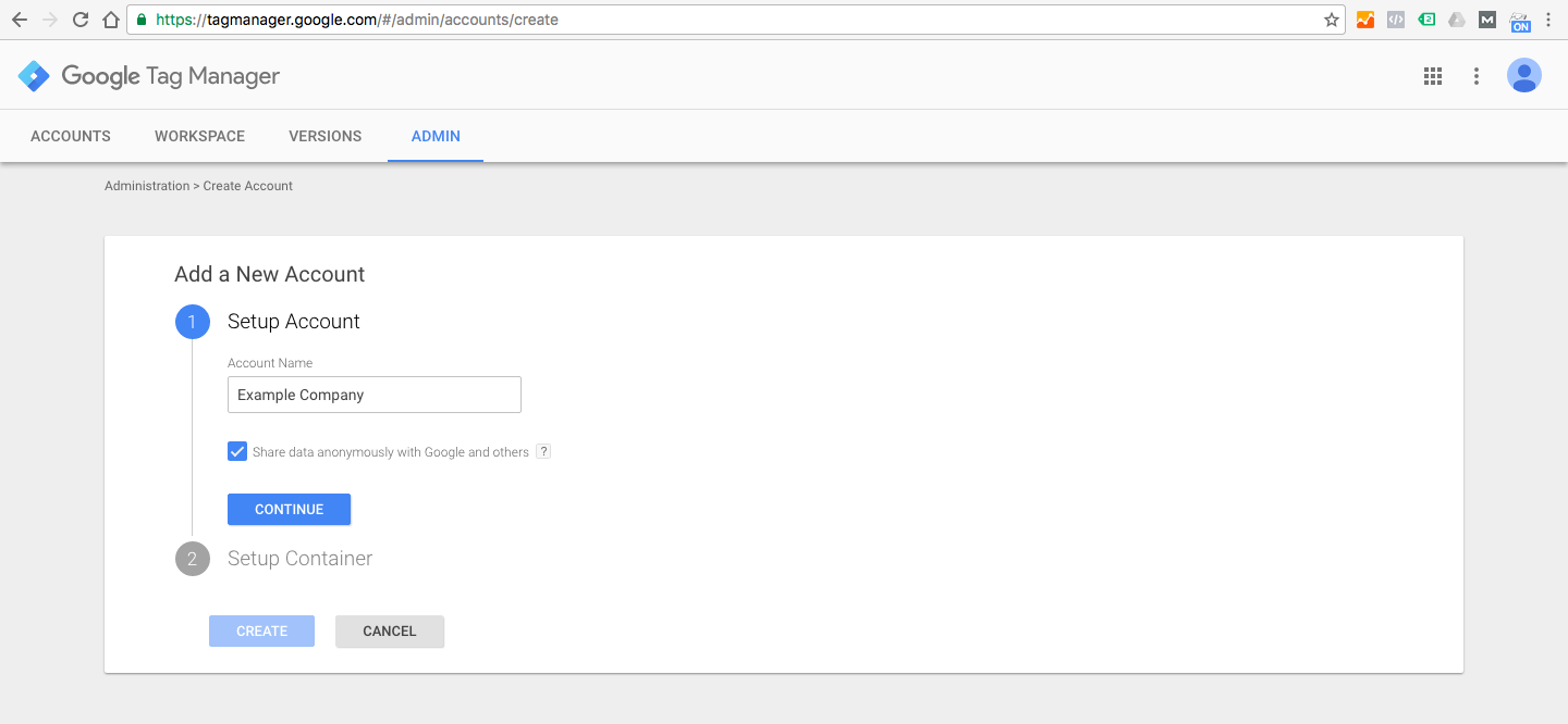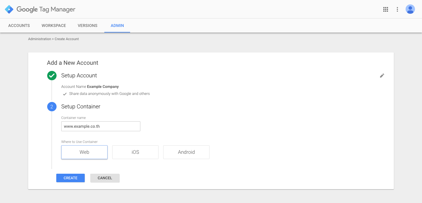 - การเริ่มต้นติดตั้งใช้งาน Google Tag Manger นั้นจำเป็นต้องมี gmail account ก่อน ถ้ามีแล้วให้เริ่มต้นโดยการ login เข้า Gmail แล้วเข้าไปที่เว็บไซต์ http://tagmanager.google.com กรณีที่ยังไม่เคยมี Account Google Tag Manager การเข้าใช้งานครั้งแรกจะต้องผ่านขั้นตอนการเซ็ตอัพ Account แรกก่อน ตามภาพตัวอย่างด้านล่างนี้ ในหน้านี้ขั้นตอนแรกให้ตั้งชื่อ Account Name แนะนำให้ใส่ชื่อบริษัทที่เป็นเจ้าของเว็บไซต์ที่จะติด tag manager ในส่วนนี้ ตามตัวอย่างตั้งชื่อว่า Example Company หลังจากนั้นให้คลิ้กที่ปุ่ม Continue จะเข้าสู่ขั้นตอนของการกำหนดชื่อ Container แนะนำให้ใส่ชื่อเว็บไซต์ ตามภาพตั้งว่า example.co.th (container คือส่วนของ script ของ tag manger ที่จะนำไปติดตั้งบนเว็บไซต์เพื่อไว้ใช้เก็บ Tag อื่นๆ อีกที) เสร็จแล้วให้เลือกประเภทของ asset ที่เราจะติด tag นี้เข้าไป เช่น web หรือ app แล้วคลิ้กที่ Create