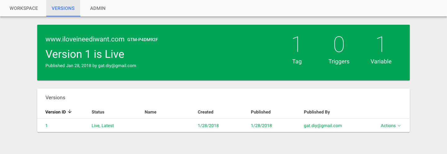 กรอกข้อมูลต่างๆ ที่เกี่ยวกับการเซ็ตอัพครั้งนี้ไว้เพื่อที่จะสามารถกลับมาอ่านได้ว่า แต่ละ Version มีการแก้ไขอะไร - เมื่อกด Publish เรียบร้อยแล้ว กลับมาที่เมนู Version ด้านบน จะเห็นว่า Tag ของ Google Analytics ที่เซ็ตอัพไปนั้น Live เรียบร้อยและเร่ิมทำงานได้แล้ว
