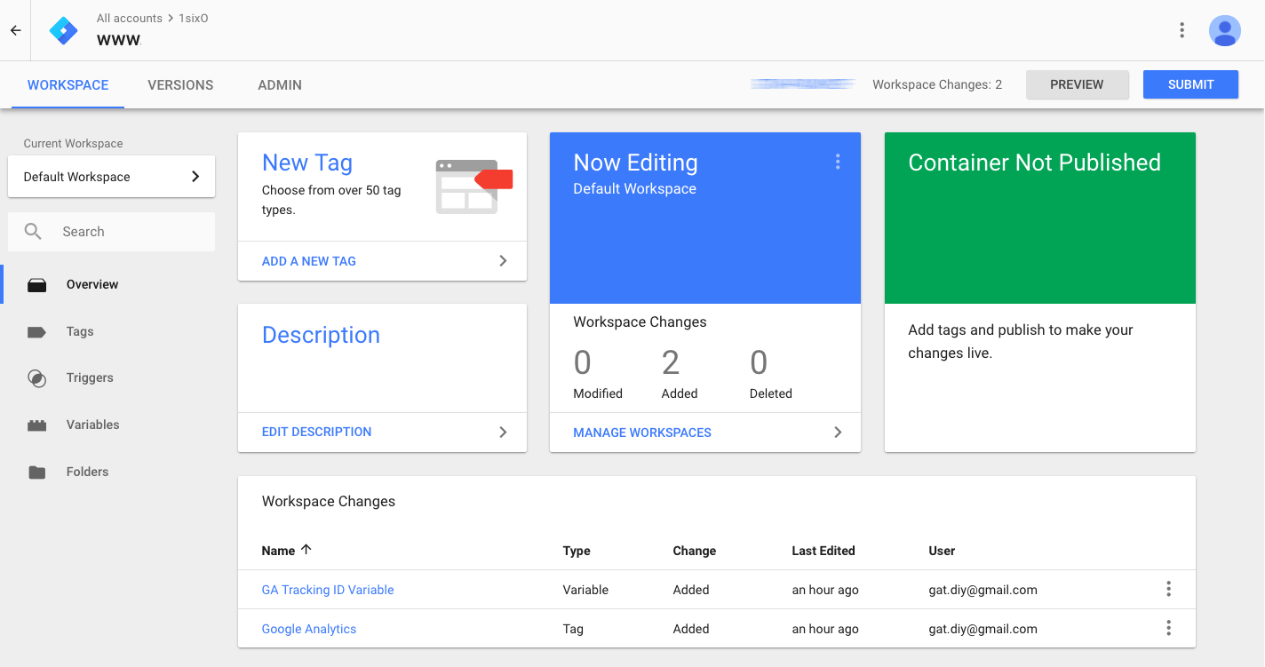4 นำ script ของ Tag Manager ไปติดตั้งบนเว็บไซต์ - หลังจากยอมรับข้อตกลงแล้ว ระบบจะพาเข้าสู่หน้า Overview ซึ่งจะแสดงค่าตั้งต้นพื้นฐานทั่วๆ ไป ถ้ามาถึงตรงนี้แสดงว่าการเซ็ตอัพ Google Tag Manager ได้ทำสำเร็จเรียบร้อยแล้ว Dashboard หลักของการใช้งานจะเข้าได้จากเมนูที่อยู่ด้านซ้ายมือ โดยส่วนที่เอาไว้ใช้สำหรับการสร้าง New Tag หรือแก้ไข Tag จะอยู่ภายใต้เมนูที่ชื่อว่า “Tags” ซึ่งการเซ็ตอัพ Google Analytics ที่กำลังจะอธิบายต่อในส่วนถัดไปนั้นก็จะอยู่ในส่วนนี้ด้วย
