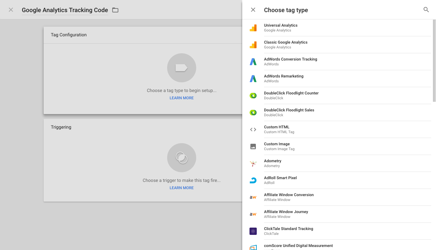 - คลิ้ก Tag Configuration ในกรอบแรก เพื่อเข้าสู่การเลือกชนิดของ Tag ที่ต้องการ ขั้นตอนนี้ให้เลือก Universal Analytics ซึ่งแสดงเป็น Tag ตัวแรก