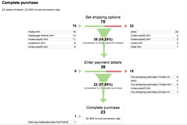 Steps ทั้งหมดที่เกิดขึ้นก่อนจะเกิด Goal (purchase) จะเป็นเหมือนเส้นตรงที่เรียงลำดับอยู่ใน กรวยน้ำ (Funnel) ซึ่งเราคงพอนึกภาพออกว่าทรงกรวยนั้นจะเล็กลงเรื่อยๆ นั่นหมายความว่า ในแต่ละสเต็ปในขั้นตอนการสั่งซื้อนั้น ปริมาณของ session จะลดลงไปทีละสเต็ป ดูจากภาพจะเห็นว่ามี 70 session เข้ามาที่หน้า shipping แล้วผ่านไปที่สเต็ป payment เพียง 38 sessions สุดท้ายจบที่หน้า Complete purchase 23 sessions และการหลุดออกไปจากสเต็ป เราเรียกกันว่า Drop-off (ดูที่แถบสีแดงในภาพก็จะบอกตัวเลขไว้เช่นกัน) ซึ่งการเห็นรีพอร์ทลักษณะนี้ก็จะช่วยให้เราสามารถทราบได้ว่า ปัญหาใน Checkout Flow เกิดขึ้นที่ Step ใด พอจะนึกภาพ Funnel ออกแล้วใช่ไหมครับ