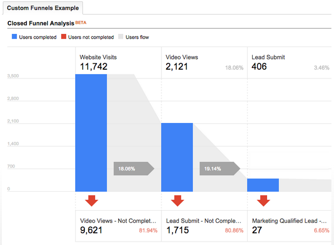 - ประการที่ 3 ซึ่งถือเป็นจุดเด่นมากของ Custom Funnel คือ แต่ละ steps นั้นมีความยืดหยุ่นในการเซ็ตมาก ซึ่งไม่จำเป็นต้องใช้ URL อย่างเดียวเหมือน Goal Funnel ตามภาพด้านบนหลังจาก step 1 คือเป็นจำนวน user ทั้งหมดที่เข้าเว็บไซต์ 11,742 และ step ที่สองเรากำหนดให้เป็นการดู VDO ตรง step นี้เราสามารถเซ็ตจาก event การกดปุ่ม Play VDO ได้ เทพไหมละครับ ส่วน step ที่ 3 เราอยากรู้ว่าคนที่ดู VDO แล้วไป submit lead เท่าไร เห็นภาพชัดขึ้นใช่ไหมครับ สิ่งนี้คือ Custom Funnel ที่เราจะกำหนดอะไรได้เกือบตามใจต้องการเลยทีเดียว