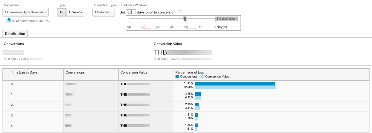 Time lag report จะเป็นรีพอร์ทที่อยู่ภายใต้ Multi-channel-funnels รีพอร์ทใน Google Analytics ซึ่งจะเป็นรายงานที่บอกถึงช่วงเวลาเป็นจำนวนวันนับจากวันที่ user มี interaction (e.g. impression, click, direct session) เป็นครั้งแรกจนถึงวันที่เกิด conversion ภายในช่วงเวลา Look Back period ซึ่งโดย default แล้วจะนับถอยหลังไป 30 วัน นับจากวันที่เกิด Conversion นั่นหมายความว่าหาก User มี interaction กับเว็บไซต์ของเราหลายครั้งก่อนจะซื้อสินค้า (ซึ่งก็ควรเป็นเช่นนั้น) ระบบจะไปดูว่าครั้งแรกที่เกิดขึ้นภายใน 30 วันย้อนหลังนั้นห่างจากวันที่เกิด Conversion เท่าไร เช่นหากพบว่าห่างจาก First interaction 10 วัน conversion นั้นก็จะตกอยู่ใน Time lag report ที่ช่วงเวลา 10 วัน Continue reading